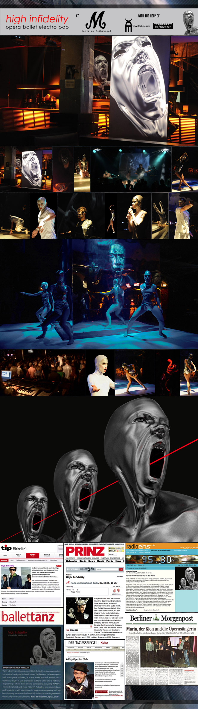 HY puts into practice its politic of offering a broad new audience the chance to discover a new generation of opera "outside-the-walls" of traditional stages, as close to the audience as possible. The Maria Am Ostbahnhof, wellknown both for its excellence in electronic music and as the most eclectic for all electro genres, is the natural choice for Ulrich to represent the diversity and the musical ambition of HY. Consequently, HY Opera starts auspiciously at club Maria, with the help of its director Ben de Biel, for a 2 1/2 hour Happening with the main artists and guests, before an audience of 350 people with an average of 32 years old.