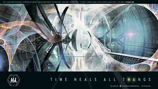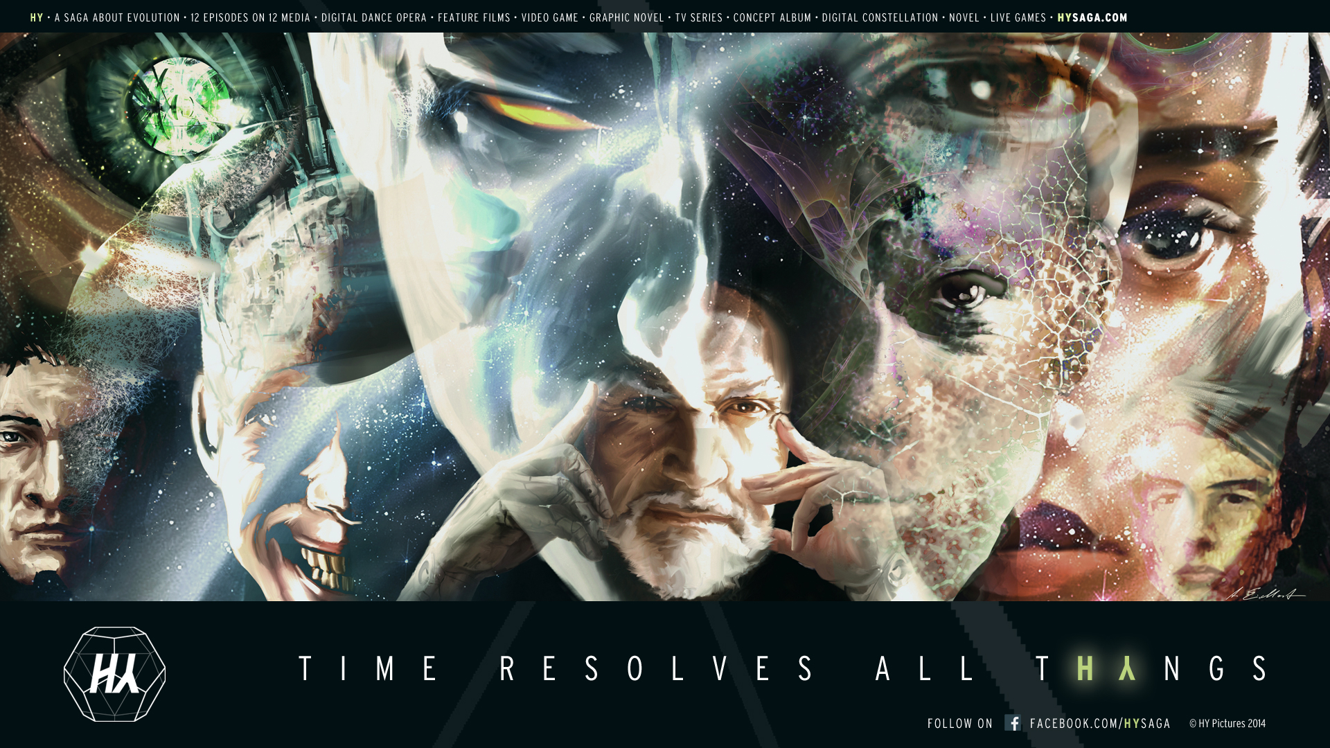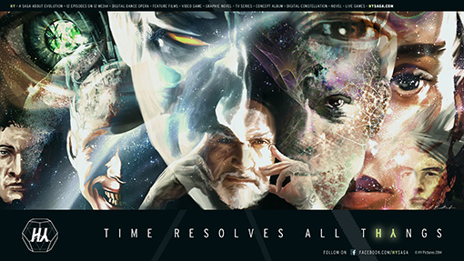 Year after year, Ulrich enriches HY as a unique, mindblowing transmedia experience. HY becomes a Transmediart saga, story about Evolution told in 12 episodes, in 12 intertwined media, including two feature films, a TV series, a video game, a graphic novel and live games, to be released from 2026 to 2030. But before that, at the start, begin the transformation of a vision to reality...